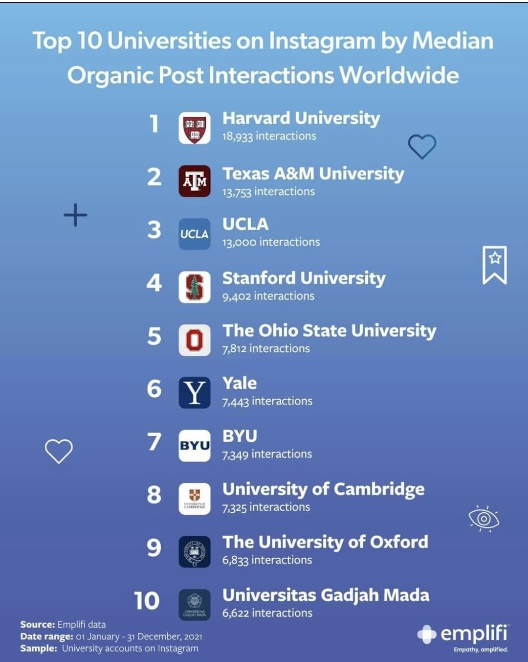 Hasil riset ini dirilis di media sosial Emplifi pada akhir Januari lalu. Dari 10 perguruan tinggi tertatas, tujuh di antaranya merupakan perguruan tinggi yang berlokasi di Amerika Serikat, sementara dua lainnya merupakan perguruan tinggi yang berlokasi di Inggris.