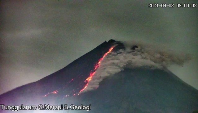 Pada periode pengamatan 6 jam atau tepatnya Jumat (2/4/2021) pukul 00.00 WIB – 06.00 WIB, awan panas pertama dan kedua terjadi pada pukul 4.13 dan 4.28 WIB.
