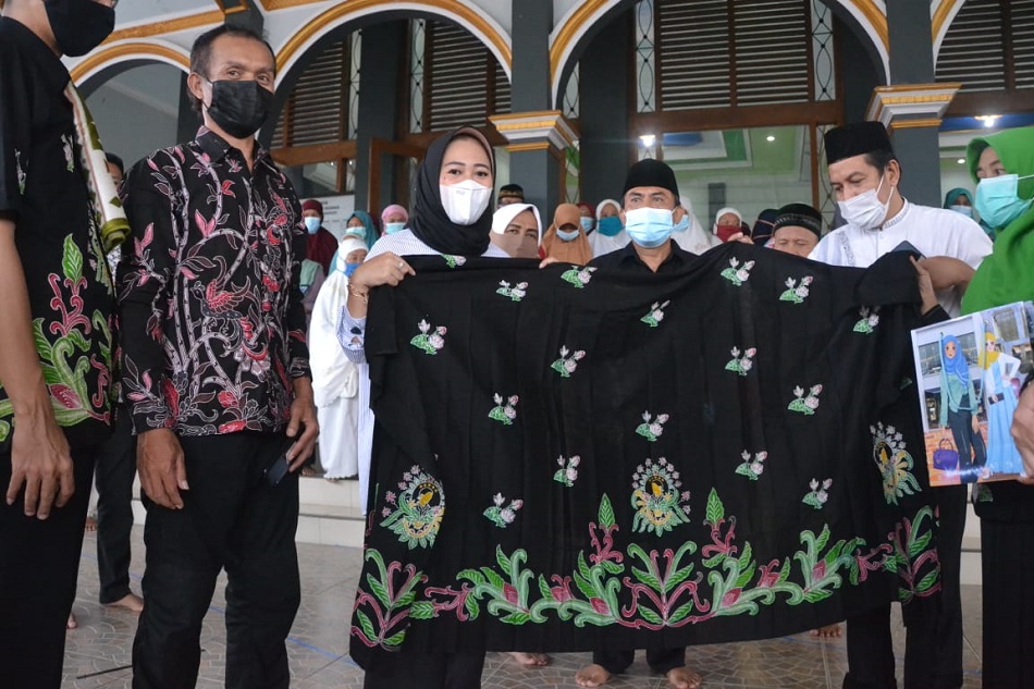 Batik Soedirman dikenalkan oleh ibu-ibu TP PKK Desa Bodaskarangjati, Kecamatan Rembang, kepada Bupati Purbalingga Dyah Hayuning Pratiwi usai mengikuti Amaliyah Ramadhan dan Sholat Ashar di Masjid Jenderal Soedirman Darul Falah, Sabtu 1 Mei 2021.