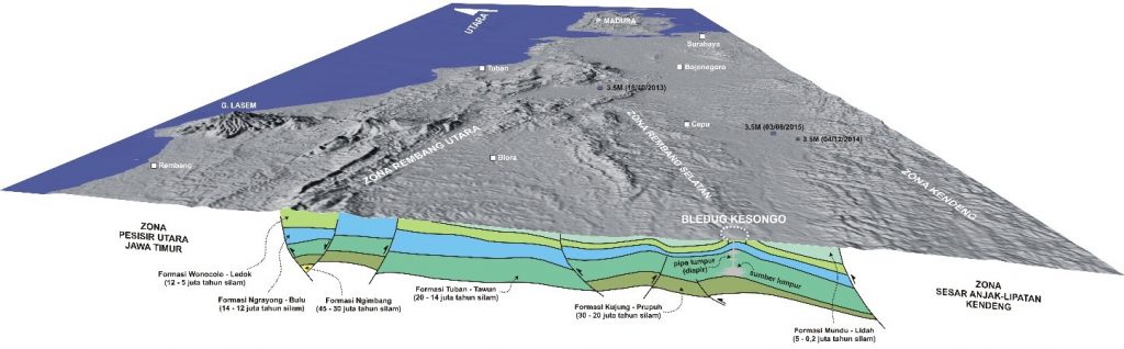 Pada Gambar 1 yang menunjukkan penampang geologi di kawasan tersebut, yang mulai dibangun oleh sedimentasi batuan laut dangkal semenjak 45 juta tahun silam. Formasi demi formasi batuan diendapkan saling bertumpuk, termasuk Formasi Tawun – yang kelak akan menjadi sumber lumpur bagi Kesongo – pada rentang 20 – 14 juta tahun silam. Laju pengendapan yang cepat umumnya mencegah lumpur untuk mengeras dan membatu, sehingga meski kemudian ditumpuk oleh formasi-formasi lain, lumpur Tawun tetap sebagai lumpur, yang tidak memiliki kesempatan terlitifikasi menjadi batu lempung. Kelak ketika bagian utara Pulau Jawa mulai terangkat di 2 juta tahun silam, bagian laut dangkal tersebut mulai didorong oleh gaya tektonik dan muncul ke permukaan, membentuk serangkaian perbukitan.