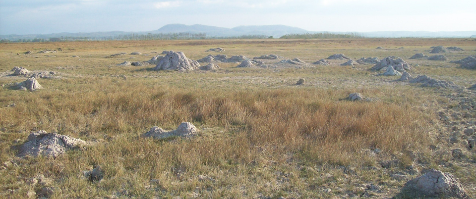 Munculnya lumpur ke permukaan menyebabkan kekosongan pada rongga yang semula dilaluinya, sehingga permukaan di sekitar kemunculan gunung lumpur tersebut akan amblas, turun membentuk depresi melingkar (depresi kaldera). Semakin besar volume lumpur yang keluar, semakin besar pula area amblasannya. Gunung Lumpur Kesongo memiliki depresi amblasan yang paling besar dibandingkan gunung-gunung lumpur lain di Kompleks Kradenan, dengan diameter 1,3 km dan menempati area 135 hektar. Aktivitas semburan lumpur menyebabkan tidak ada pepohon yang mampu tumbuh di dalam depresi kaldera Kesongo, hanya rerumputan dan semak belukar saja yang mendominasi, sehingga masyarakat setempat lebih mengenalnya sebagai Oro-oro Kesongo, tempat yang banyak rumput untuk mengembalakan ternak (Gambar 2).