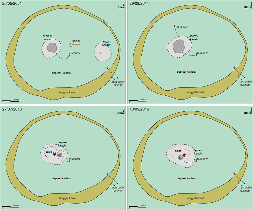 Gunung lumpur yang menyebabkan kaldera seluas itu kini sudah hilang, digantikan oleh berbagai kerucut lumpur (grifon) dan genangan lumpur (salsa) di sekitarnya. Saat ini salsa yang aktif terisi lumpur basah menempati sisi barat, dengan diameter 0,3 km dan area 8 hektar. Tidak diketahui sejak kapan salsa tersebut aktif, namun dinamikanya dapat dicermati pada Gambar 3. Dari serangkaian citra satelit dalam 20 tahun terakhir, tampak dinamika grifon di dalam salsa tersebut, yang mengindikasikan dinamika Erupsi lumpur dan diapir di bawahnya. Awalnya grifon berada di sisi baratlaut salsa, dimana setelah letusan besar 2009 semakin membesar, dan ketika letusan besar 2013 grifon aktif pindah ke sisi timur salsa. Kemudian semenjak 2016 titik grifon menempati letaknya saat ini, yaitu di sisi selatan salsa (Gambar 4).
