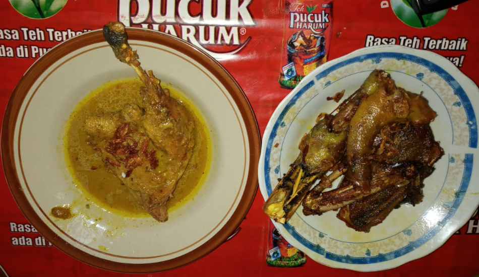 Opor bebek masakan Ibu Komsinah atau lebih dikenal dengan panggilan Bu Kom, rasanya enak tenan. Sajian opornya dilengkapi dengan kuah tersendiri, sayur daun pepaya, dan sambal.
