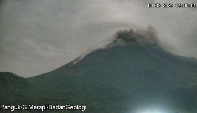 Sebelumnya, Minggu (7/3/2021) malam, BPPTKG juga mencatat tiga kali awan panas guguran dari Gunung Merapi dengan jarak luncur maksimum 1.500 meter atau 1,5 km ke arah barat daya.