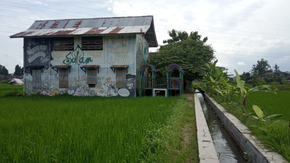 BANTUL– Sanggar Anak Alam (SALAM) berada di tengah persawahan Kampung Nitiprayan, Kelurahan Ngestiharjo, Kasihan, Bantul. Tersaji hamparan padi di sepanjang kanan dan kiri selokan air yang menyisakan jalan kecil untuk dilewati.
