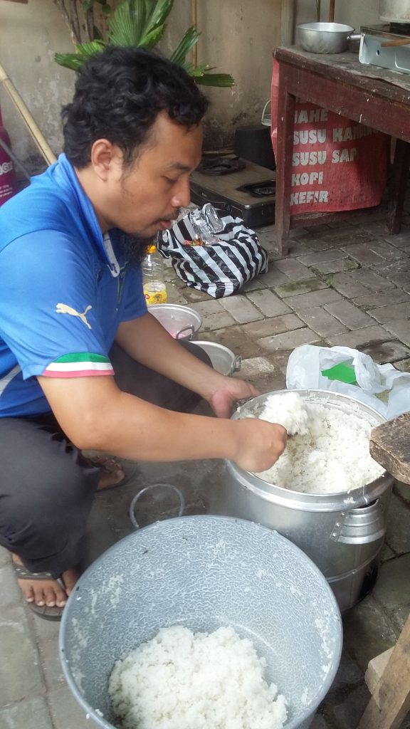 Tempat masaknya berpindah-pindah, kemarin di rumah Muhammad Helmi Rahman, Ketua RW III. Sejumlah ibu-ibu PKK yang diketuai Ny. Bambang Supeno sejak pukul 06.00 sampai 11.00 membungkusi nasi dengan lauk bakmi, bakwan, tempe, dan sayur. Tukang masaknya dua laki-laki yang tampak biasa masak.