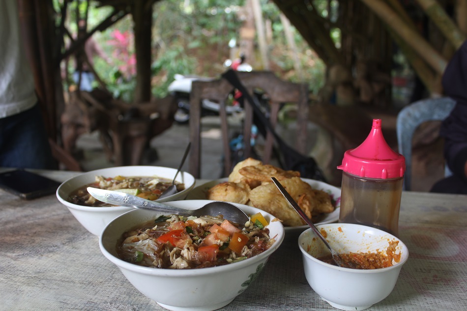 Berada di area persawahan tak jauh dari pintu masuk destinasi wisata Gunung Api Purba. Di sekeliling warung banyak pohon rindang. Suasana sangat teduh, sesekali angin sepoi-sepoi menyapu pepohonan.