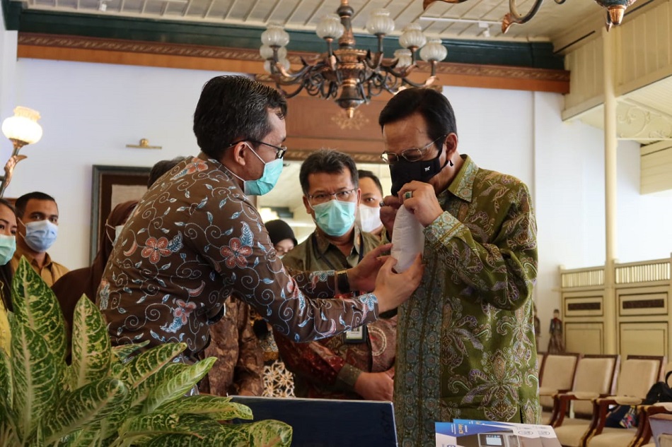 YOGYAKARTA – Gubernur DIY, Sri Sultan Hamengkubuwono X, mencoba alat diagnosis cepat infeksi Sars-Cov2 melalui embusan nafas buatan UGM, saat menerima pimpinan serta peneliti UGM dalam audiensi yang berlangsung Senin (12/10/2020).