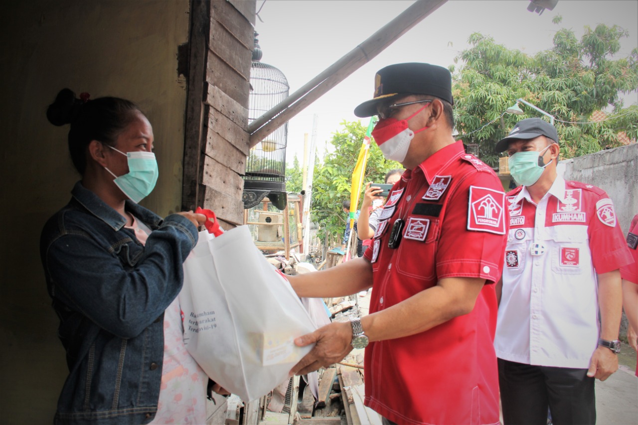 Kegiatan dilanjutkan dengan penyerahan bantuan on the spot kepada masyarakat di RT 8 RW 2 Jalan Pandansari Permai Kelurahan Sawah Besar. Adapun paket bantuan yang diberikan berupa sembako, suplemen, masker, dan hand sanitizer.