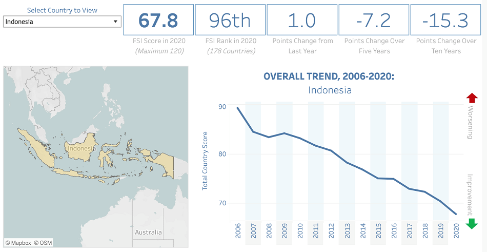 Merujuk pada Fragile States Index (Indeks Negara Rentan) yang dirilis oleh Lembaga The Fund for Peace pada tahun 2020, menunjukkan bahwa Indonesia masih berada pada kondisi “dalam peringatan”. Indonesia memperoleh skor 67,8 dan menduduki peringkat ke-96 dari 178 negara yang diukur secara keseluruhan.