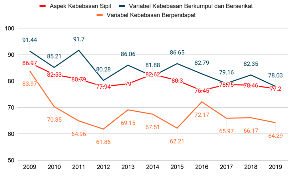 Mengukur ada atau tidaknya represi politik dapat ditelusuri melalui kondisi kebebasan sipil. Ditinjau dari Indeks Demokrasi Indonesia (IDI) yang diterbitkan Badan Pusat Statistik (BPS), skor aspek kebebasan sipil dalam 10 tahun terakhir menunjukkan penurunan dari semula 86,97 di tahun 2009, menjadi 77,2 di tahun 2019. Menurunnya aspek tersebut tidak terlepas dari kontribusi dua variabel turunan yang juga terus menurun, yaitu variabel kebebasan berkumpul dan berserikat (semula 91,44, menjadi 78,03) serta variabel kebebasan berpendapat (semula 83,97, menjadi 64,29).