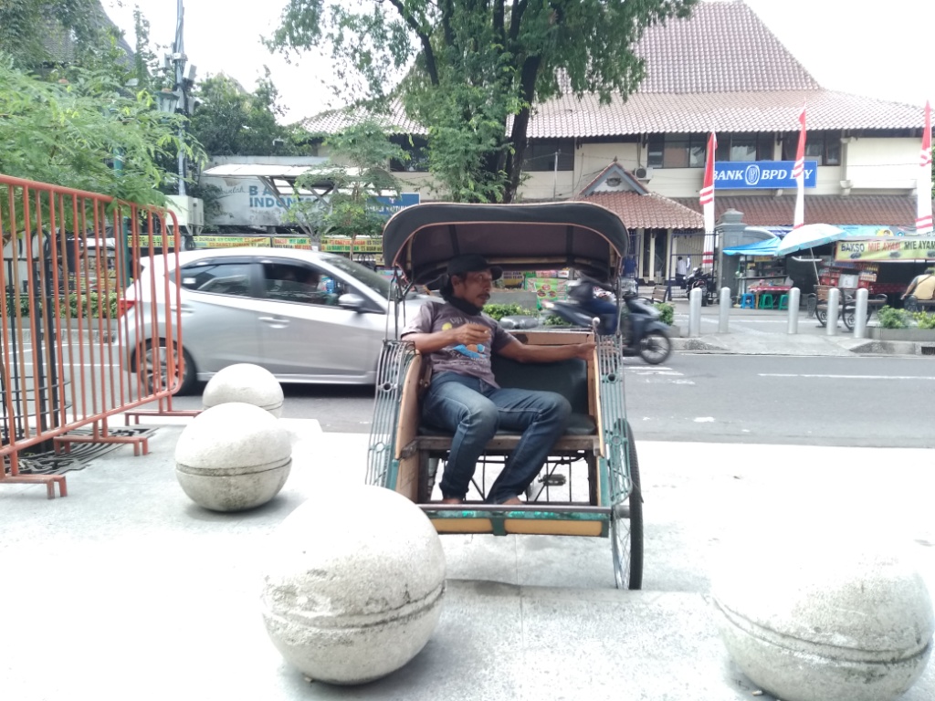 “Jangan, jangan, tidak usah Pak. Jika Bapak tidak mau naik becak saya, tidak perlu memberi uang Pak,” ujar Pak Budi, tukang becak yang mengaku tinggal di Kemetiran, Yogyakarta.