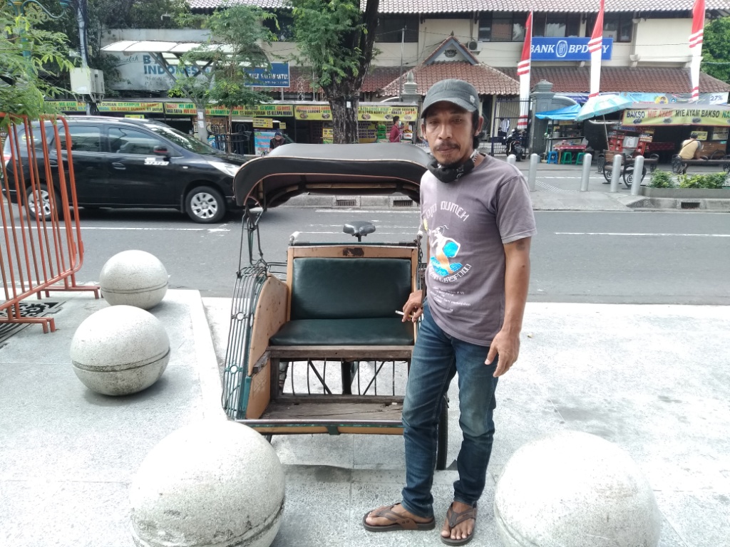 “Jangan, jangan, tidak usah Pak. Jika Bapak tidak mau naik becak saya, tidak perlu memberi uang Pak,” ujar Pak Budi, tukang becak yang mengaku tinggal di Kemetiran, Yogyakarta.