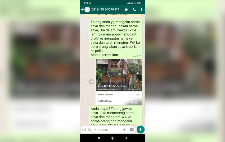 Bapak dua anak ini, mengaku tak melaporkan kejadian ini kepada Polisi, karena belum ada temannya yang tertipu. Namun, dia memantau melalui handphone lainnya, mengetahui pelaku penipuan sudah mengganti nama dan profil WA-nya.
