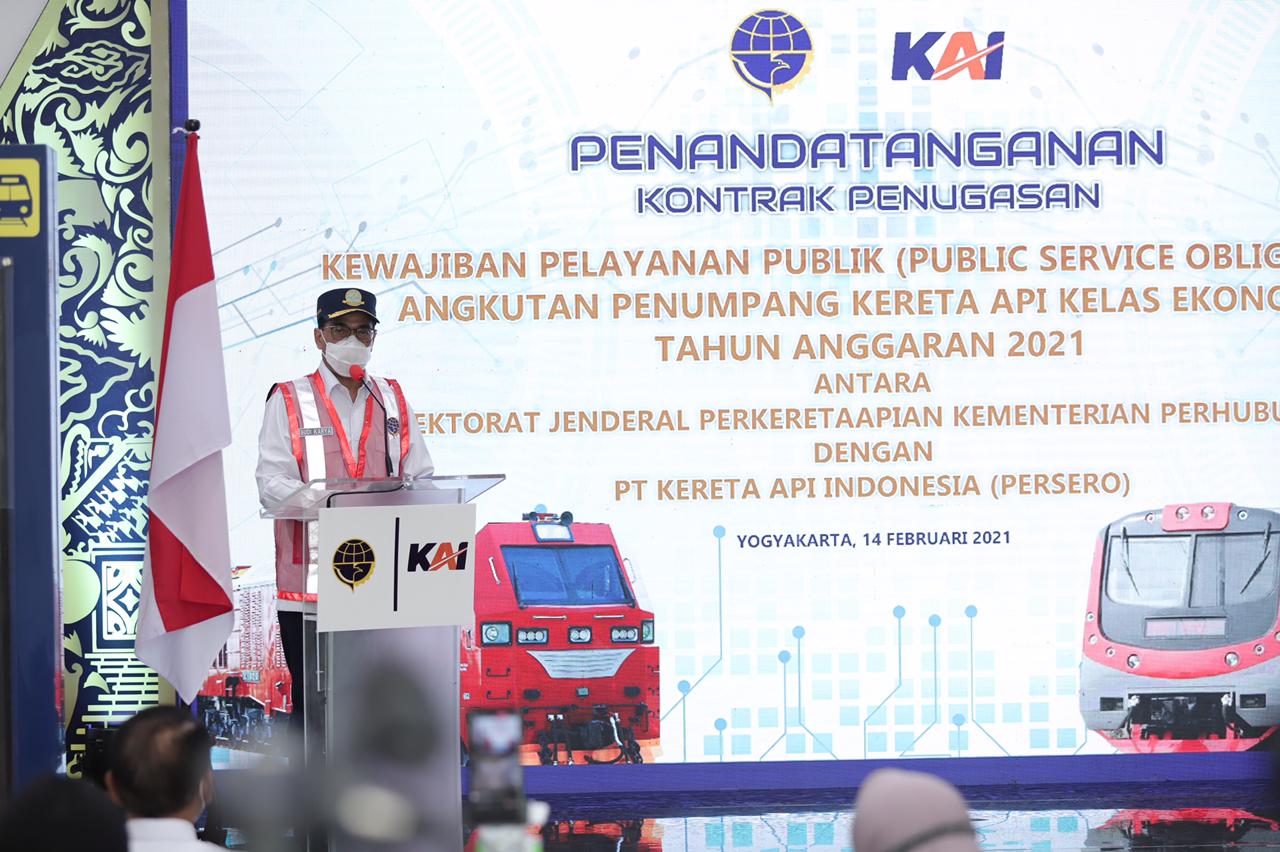 YOGYAKARTA – Menteri Perhubungan RI, Budi Karya Sumadi, melakukan kunjungan ke Stasiun Tugu Yogyakarta pada Minggu (14/2). Kunjungan ini untuk menyaksikan penandatanganan kontrak penugasan Public Service Obligation angkutan penumpang kereta api kelas ekonomi tahun angkatan 2021 sekaligus meninjau penerapan GeNose yang telah berjalan kurang lebih dua minggu ini.