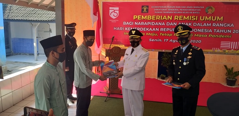 YOGYAKARTA – Sebanyak 14 Warga Binaan Rutan Kelas IIB Wates mendapatkan Remisi Hari Ulang Tahun (HUT) Kemerdekaan ke-75 Republik Indonesia. Penyerahan Surat Keputusan Pemberian Remisi bagi 14 warga binaan tersebut dilakukan secara simbolis oleh Bupati Kulon Progo, Drs. H. Sutedjo kepada 2 perwakilan warga binaan Rutan Wates, setelah dilaksanakannya upacara Peringatan Detik-Detik Proklamasi Kemerdekaan di Pemda Kulon Progo, Senin (17/8/2020).