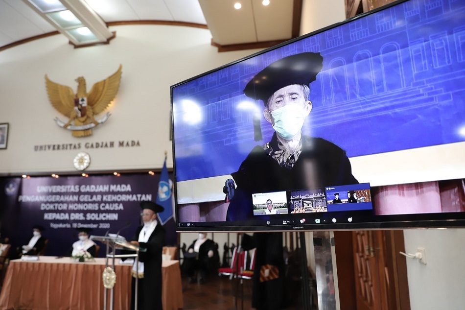 YOGYAKARTA – Universitas Gadjah Mada menganugerahkan gelar Doktor Honoris Causa kepada Drs. H. Solichin, Jumat (18/12/2020). Gelar ini diberikan sebagai bentuk apresiasi atas kontribusi Solichin dalam mengembangkan bidang keilmuan filsafat wayang dan memajukan pewayangan Indonesia.