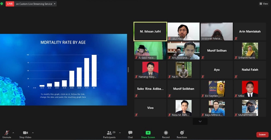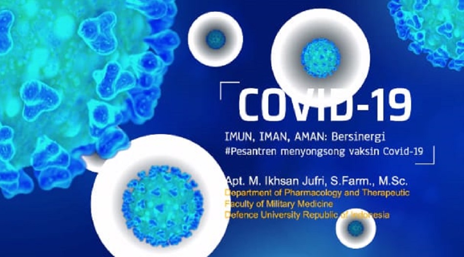 “Maka agar terhindar dari virus Covid-19, bisa dilawan dengan kepatuhan semua pihak untuk taat pada protokol kesehatan. Cuci tangan memakai sabun, mengenakan masker, mengonsumsi teratur makanan sehat dan bergizi, olahraga, jaga jarak dan menghindari kerumunan adalah upaya preventif (pencegahan) terhadap penularan Covid-19,” kata Dosen Farmakologi dan Terapi Fakultas Kedokteran Militer Universitas Pertahanan Republik Indonesia M Ikhsan Jufri SFarm MSc dalam program Ngobrol tentang Pesantren dan Santri (NGOPI) Pusat Studi Pesantren dan Pendidikan (PUSPPA) dengan tema “Imun, Iman, Aman: Pesantren Menyongsong Vaksin Covid-19” melalui Zoom, Kamis (17/12/2020).