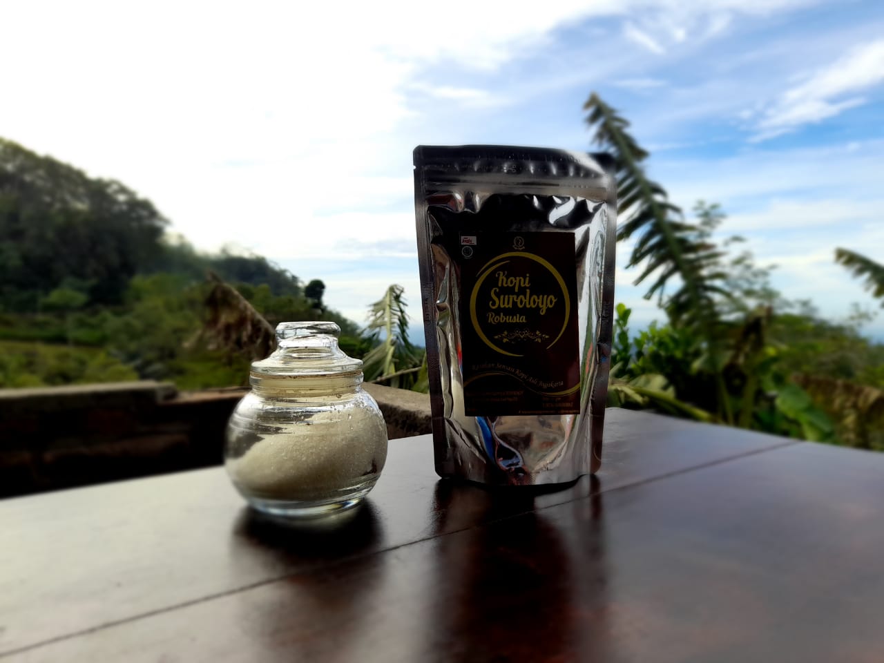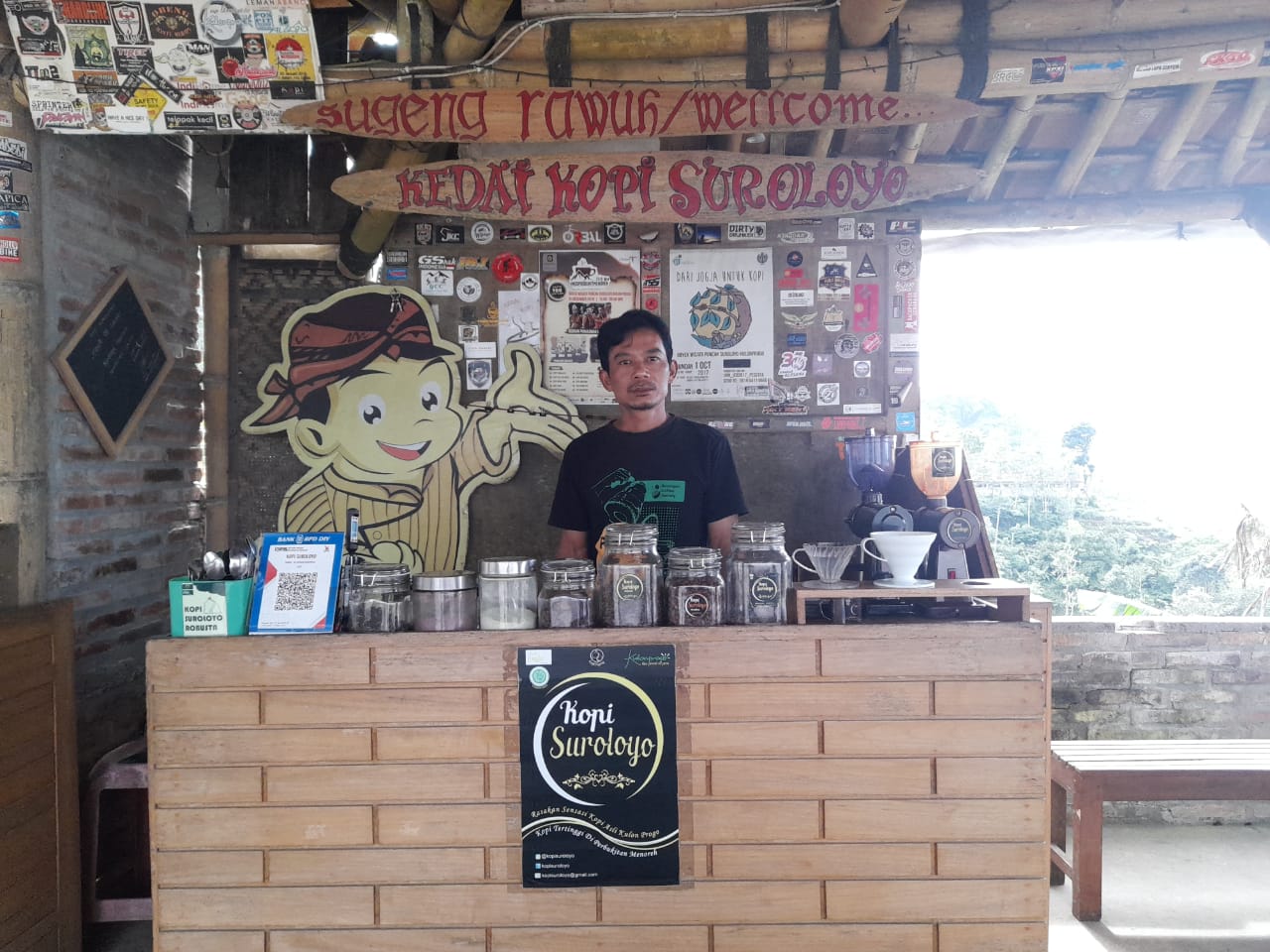 “Pada titik ini (kedai kopi), berada di ketinggian 950 mdpl,” katanya. Kopi-kopi di kedai tersebut, jelas Ngatiman, dihasilkan dari kebun petani dan diolah oleh petani setempat. Kopi yang tersedia antara lain, kopi arabika Suroloyo, kopi wine tubruk, kopi arabika Suroloyo wine saring/V60, kopi arabika Suroloyo tubruk, kopi arabika Suroloyo saring/V60, kopi robusta Suroloyo tubruk, kopi robusta Suroloyo saring/V60, kopi blend Suroloyo tubruk, kopi blend Suroloyo saring/V60, kopi susu Suroloyo, kopi Suroloyo drip, kopi susu semar, kopi moka. Harganya terhitung murah, cocok dinikmati dalam suasana dingin hawa pegunungan.