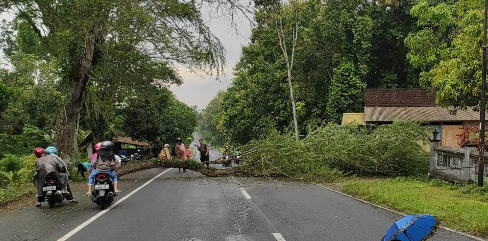KULONPROGO – Seorang pengendara motor warga Dayakan Pengasih Kulonprogo, Damar Arimbaga Nugraha (20), meninggal dunia setelah tertimpa dahan pohon asem yang patah akibat pohon tumbang di Jalan Raya Sentolo – Pengasih, Tegowanu Kaliagung Sentolo, Jumat (19/2). Korban meninggal dunia di lokasi kejadian akibat luka serius di bagian kepala.