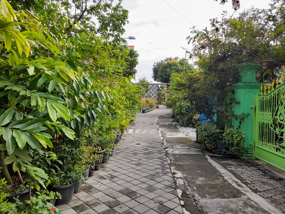 Sepanjang jalan, tanaman sayur-mayur subur melambai-lambai dari dalam pot kantong yang ditempelkan di tembok milik warga sekitar. Mulai dari kangkung, sawi, dan selada. Sedangkan di pot duduk, terong-terong tegak berdiri.