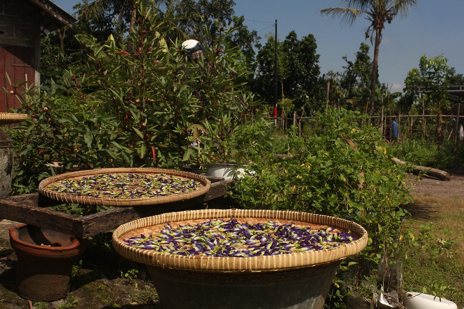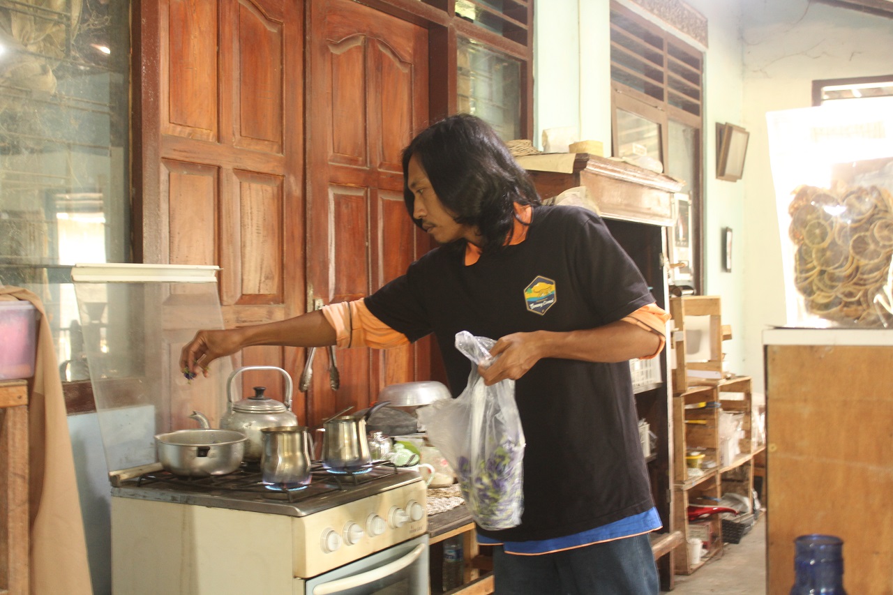 “Teh ungu dan biru menggunakan bunga telang yang kami tanam di luar. Teh warna biru ini karena ditambahi jeruk. Kalau tepala bahan dasarnya ada pala, bunga telang dan bunga rosela,” katanya sambil membuat minuman.