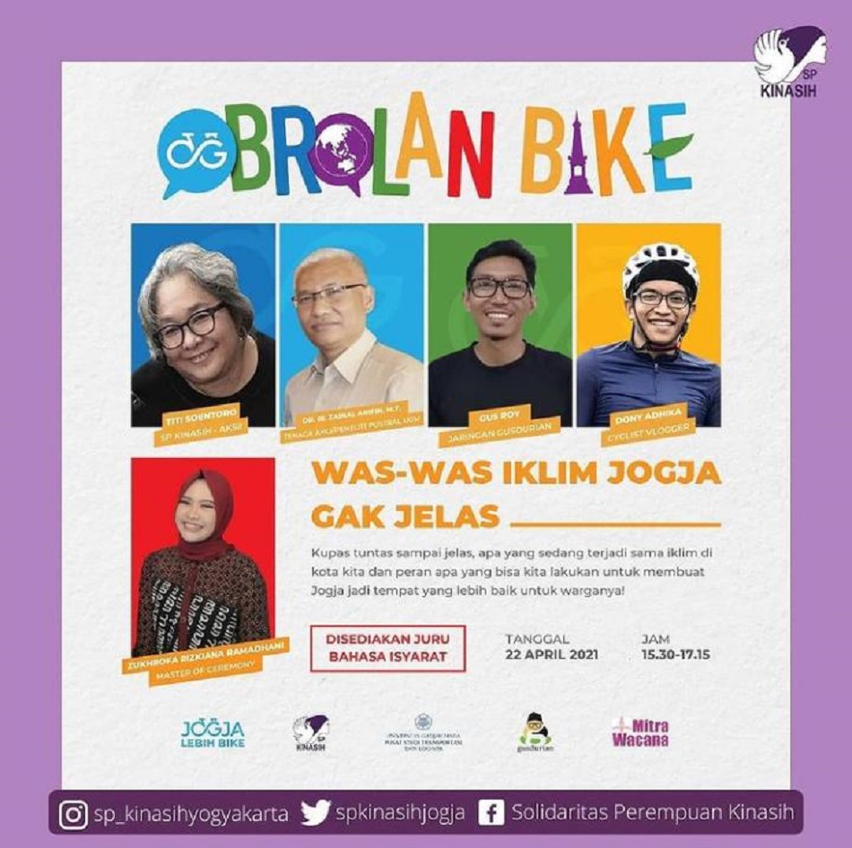 YOGYAKARTA – Bertepatan dengan peringatan Hari Bumi yang jatuh pada 22 April setiap tahunnya, Solidaritas Perempuan (SP) Kinasih, Mitra Wacana, Jaringan Gusdurian, Pusat Studi Transportasi dan Logistik (Pustral) UGM, serta Jogja Lebih Bike menginisiasi platform komunikasi Obrolan Bike. Lalu berkolaborasi menggelar diskusi yang bertema “Was-was Iklim Jogja Nggak Jelas” secara virtual pada Kamis, 22 April 2021.