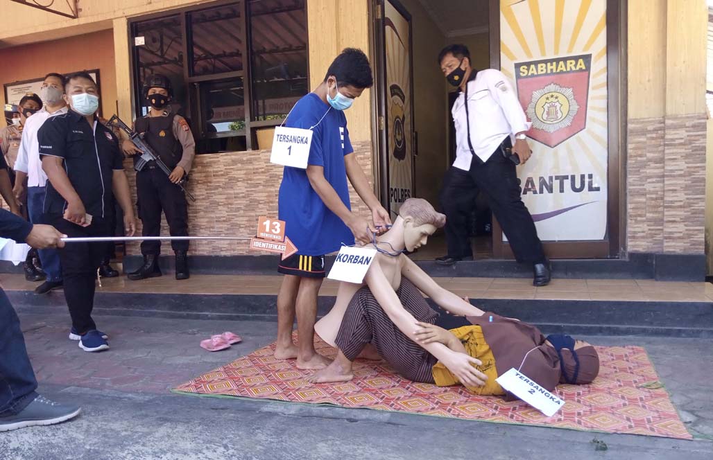 BANTUL –-Reka ulang kasus pembungkus berencana terhadap bos pabrik wajan, Budiantoro (38) dilaksanakan di halaman Mapolres Bantul, Kamis (22/4). Dalam pembunuh berencana tersebut terungkap tersangka NK (22) menghabisi nyawa korban saat berhubungan intim dengan tersangka Kl (30) yang tak lain sebagai istri korban sendiri.