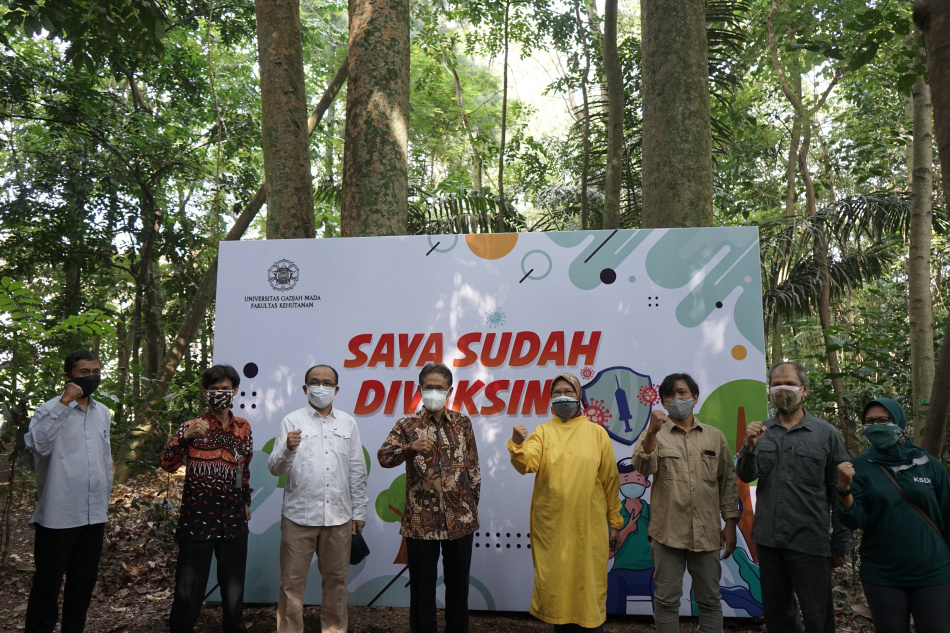 Dr. Widyanto Dwi Nugroho, S.Hut., M.Agr.Sc., Wakil Dekan Bidang Akademik dan Kemahasiswaan Fakultas Kehutanan UGM, menambahkan bahwa vaksinasi Covid-19 hari ini dilaksanakan di Arboretum atau Hutan Mini Fakultas Kehutanan UGM untuk mengingatkan kepada kita bahwa pabrik oksigen adalah hutan.