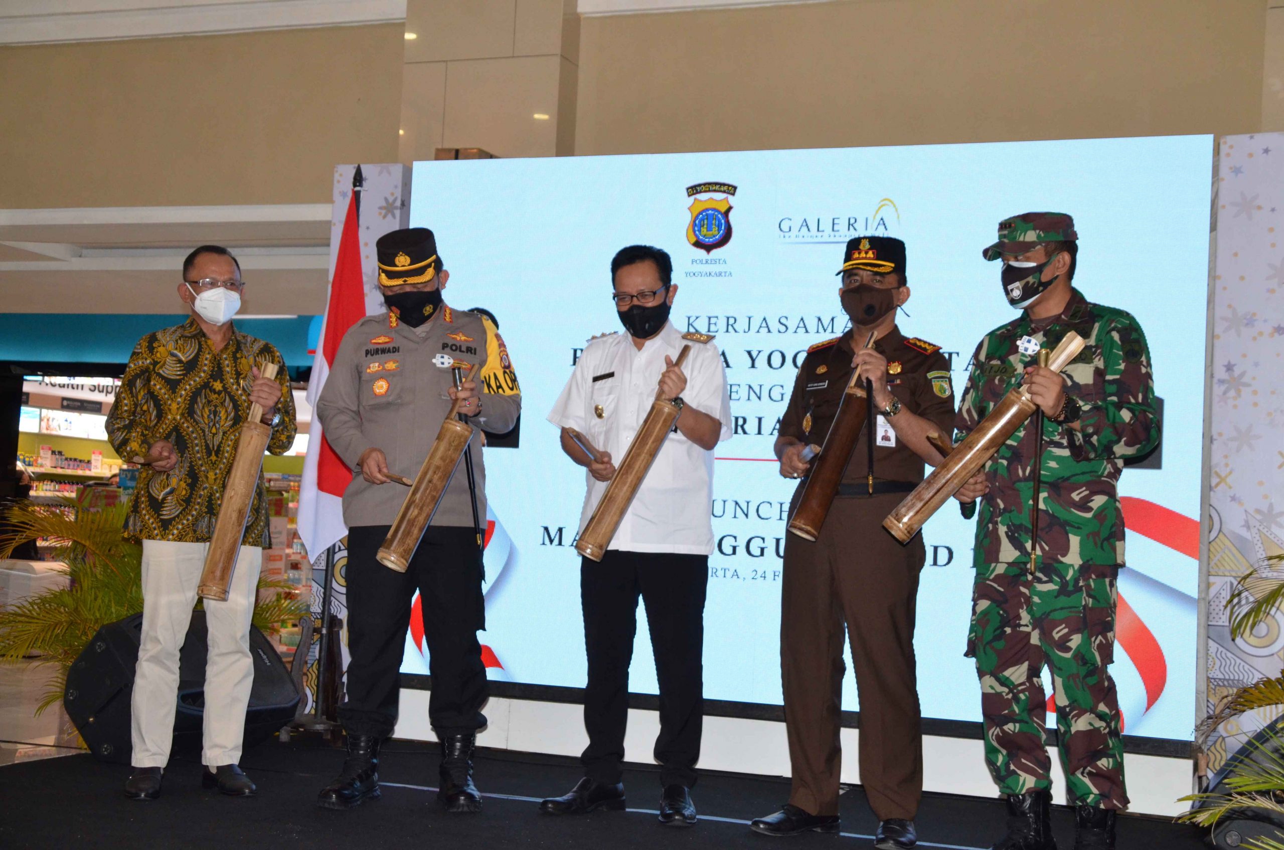 JOGJA – Polresta Yogyakarta meluncurkan pusat perbelanjaan atau Mall Tangguh Covid-19 di Galeria Mall Yogyakarta, Rabu (24/2). Keberadaan Mall Tangguh Covid-19 yang mengedepankan protokol kesehatan diharapkan bisa mencegah sebaran virus dan mendorong pertumbuhan ekonomi masyarakat.
