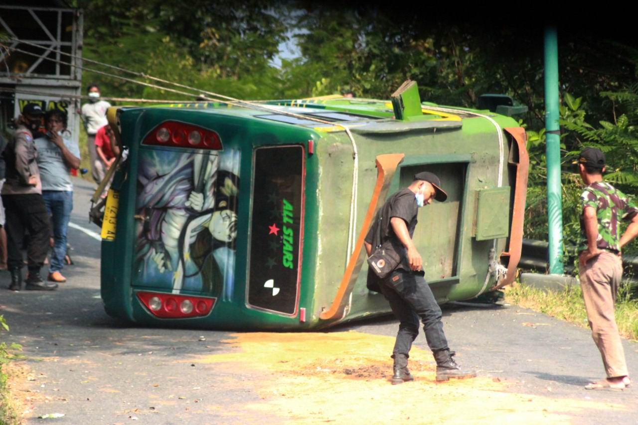 BANTUL – Sebuah mikrobus yang mengantar rombongan takziah, terguling saat gagal menanjak di Jalan Imogiri- Dlingo Kelurahan Dlingo, Dlingo, Bantul, Senin (24/5). Belasan peziarah yang berada di dalam bus terluka. Polisi menduga sopir tak hafal jalur menanjak.