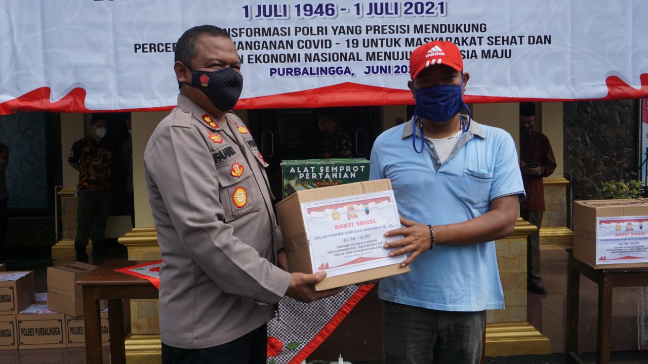 PURBALINGGA – Polres Purbalingga membagikan sembako bagi warga terdampak Covid-19. Selain itu, juga membagikan satu set peralatan penyemprotan disinfektan untuk pondok pesantren dan desa yang menjalankan lockdown lokal. Kegiatan itu, dilaksanakan dalam rangka menyambut Hari Bhayangkara ke-75 tahun 2021.