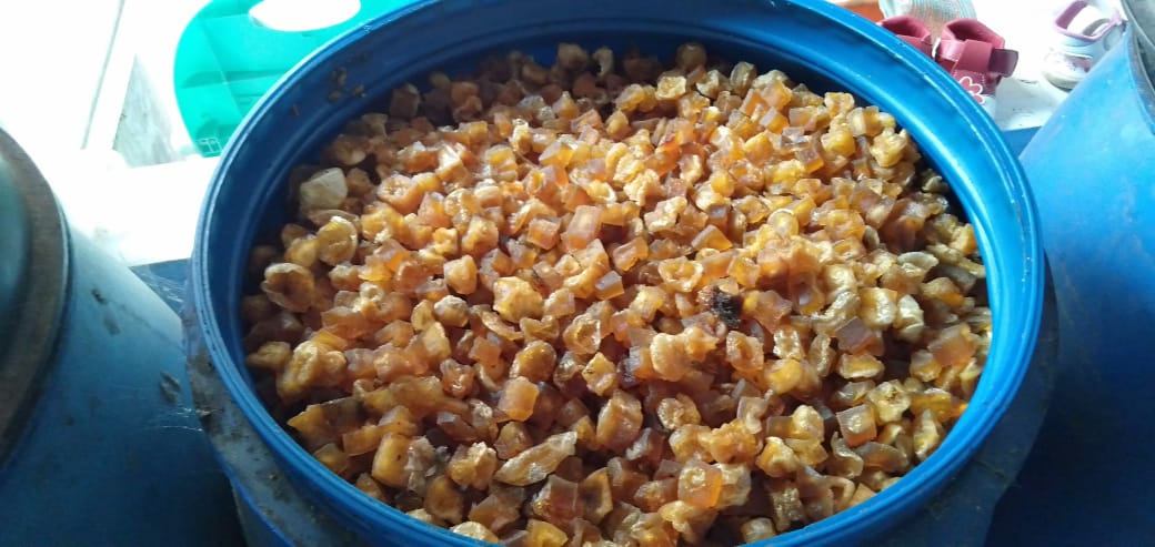 Setiap satu bulan memproduksi kulit sebanyak 5 kuintal. “Ini gabungan antara kulit kerbau dan sapi,” jelasnya. Perbedaan antara kulit kerbau dan sapi. Kalau kulit kerbau lebih tebal kemudian dimakan rasanya enak. Sedangkan sapi kulitnya panjang.