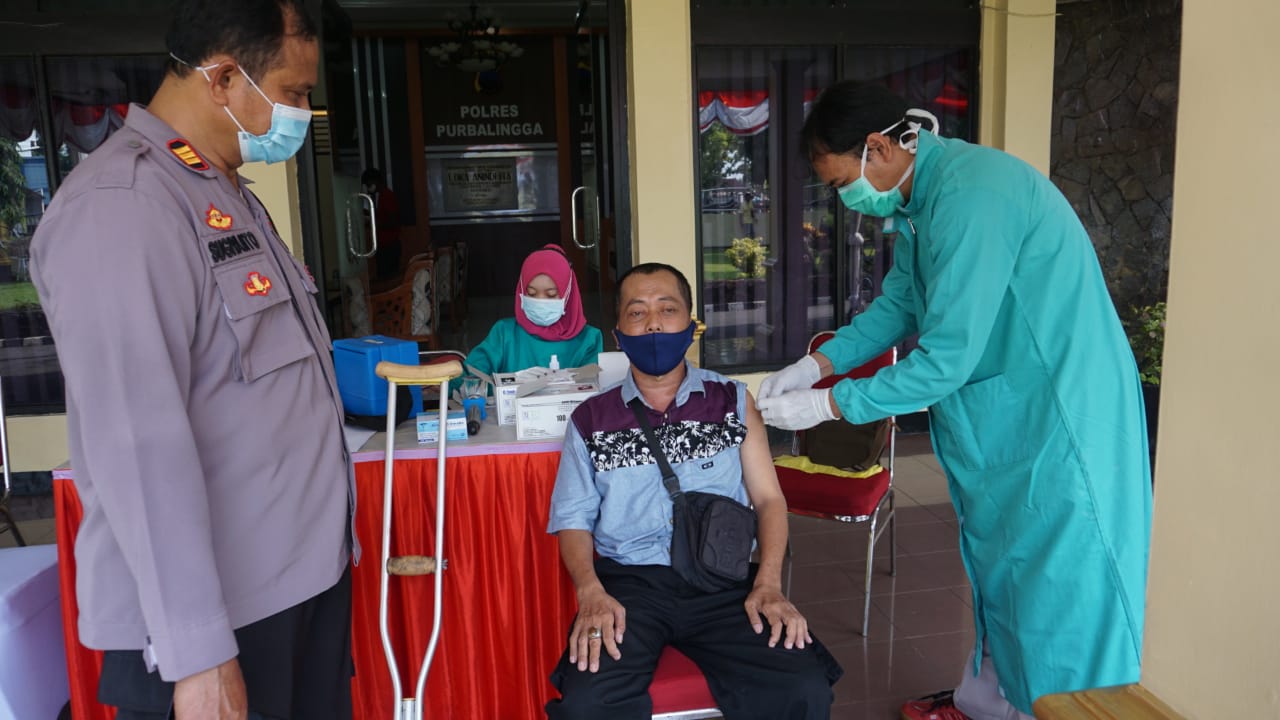 PURBALINGGA – Polres Purbalingga menggelar vaksinasi massal program Serbuan Vaksinasi Nasional TNI-Polri Satu Juta Vaksin Sehari yang dilaksanakan serentak di 34 wilayah Kepolisian Daerah (Polda), Sabtu, 16 Juni 2021. Tak hanya masyarakat umum, vaksinasi yang digelar di Mapolres Purbalingga itu, juga menyasar para difabel.