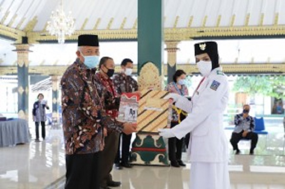 SLEMAN – Pemkab Sleman memberikan Beasiswa kepada delapan Pengibar Bendera Pusaka (Paskibraka) pada peringatan HUT RI ke-75 tahun 2020. Penyerahan beasiswa sebagai bentuk apresiasi dan motivasi itu dilakukan langsung oleh Bupati Sleman Sri Purnomo di Pendopo Parasamya, Komplek Pemda Sleman, Kamis (24/9/2020).