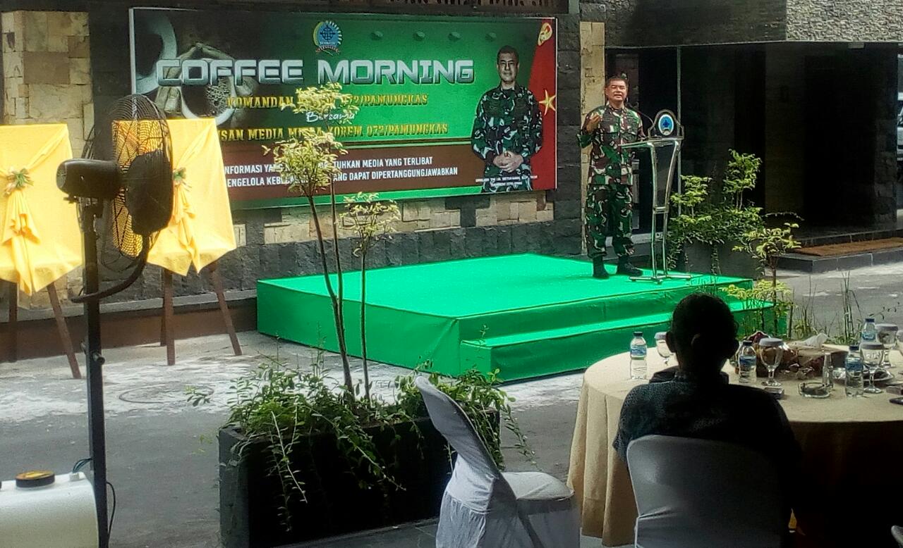 YOGYAKARTA – Belasan wartawan media cetak, elektronik dan online mengikuti Coffee Morning bersama Komandan Korem 072/Pamungkas Brigjen Ibnu Bintang Setiawan SIP MM. Acara yang dilangsungkan di Makorem 072/Pamungkas Jumat 28 Mei 2021 juga dihadiri cucu pahlawan revolusi Brigjen Katamso dan putra Kolonel Sugiono.