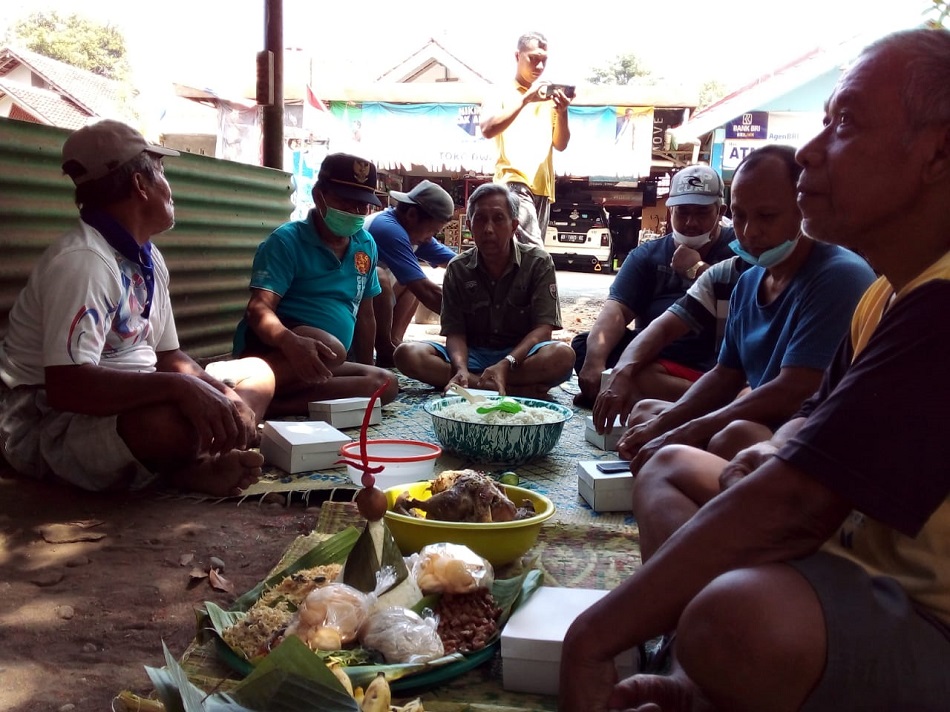 KULONPROGO – Nasi uduk, ingkung ayam, nasi tumpeng beserta sayur pelengkap dan minuman es dawet disajikan saat istirahat kerja bakti mendirikan gardu ronda Padukuhan Karangwetan RT 19 RW 10 Salamrejo Sentolo. Karena makanan sudah siap tersaji, warga yang ikut kerja bakti pada Minggu 29 Agustus 2021 sepakat langsung memanjatkan doa dipimpin kaum rois Budi Suyatno.