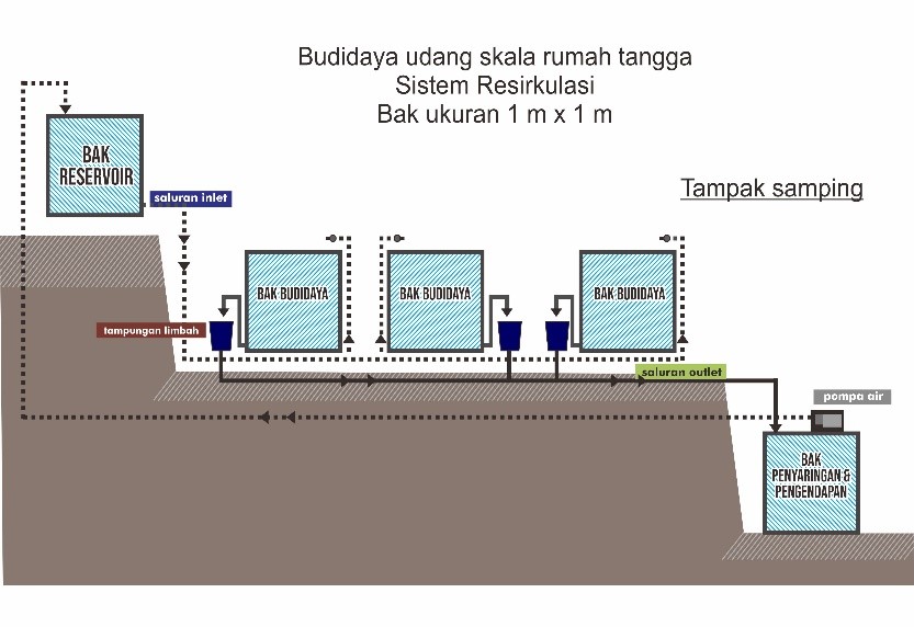 Teknik pengairan dilakukan secara resirkulasi dan pengelolaan budidaya udang secara intensif; lahan sempit, padat penebaran tinggi, penggunaan pakan yang cukup dan seimbang, inovasi teknologi dan pengelolaan limbah sehingga berkelanjutan dan ramah lingkungan. Skala usaha kecil atau skala rumah tangga ini dapat melibatkan lebih banyak masyarakat bermodal rendah sampai menengah, pengawasan dan pengelolaan lebih mudah, penggunaan air laut lebih sedikit, bahkan lebih banyak air tawar karena jenis udang vaname memiliki daya tahan dalam air salinitas rendah dan hidup dalam semua kolom air dengan kepadatan tinggi sehingga produksinya tinggi.