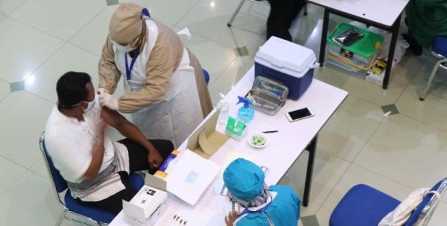 Jogja – Auditorium Prof.Abdul Kahar Mudzakkir Universitas Islam Indonesia (UII), Ngemplak, Kabupaten Sleman menjadi lokasi vaksinasi Covid-19 massal, Selasa (30/3/2021).