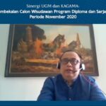 YOGYAKARTA – UGM dan KAGAMA menyelenggarakan Pembekalan Calon Wisudawan Program Diploma dan Sarjana Periode November 2020 secara daring, Rabu (18/11/2020). Dalam kesempatan