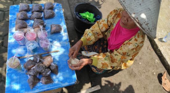 MBAH Marsih. Usia 85 tahun masih aktif bekerja. Sehari-hari, simbah jualan pakan ikan dan mainan gelembung di pinggir Telaga Potorono, Kelurahan Potorono,