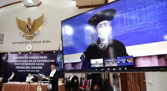 YOGYAKARTA – Universitas Gadjah Mada menganugerahkan gelar Doktor Honoris Causa kepada Drs. H. Solichin, Jumat (18/12/2020). Gelar ini diberikan sebagai bentuk apresiasi
